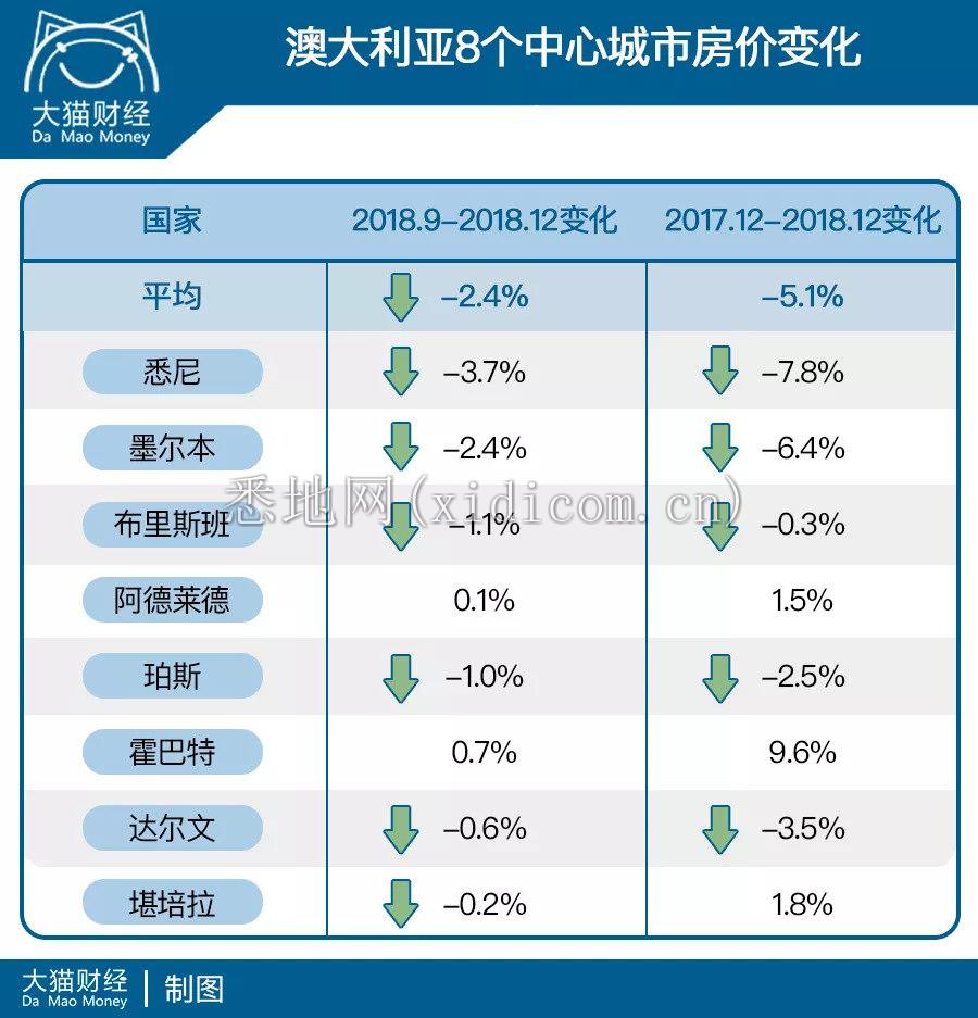 澳大利亚统计局(ABS)的数据显示,澳大利亚八个中心城市的平均房价在2018年跌了5.1%,到2018年第四季度,澳大利亚的国内住宅总价值已经只剩下6.7万亿澳元了。