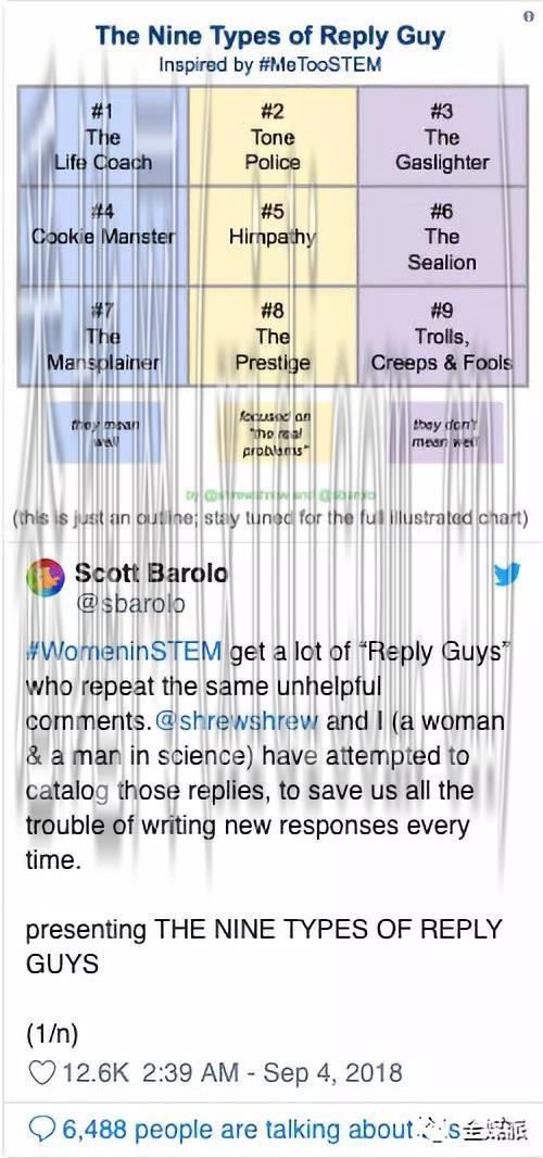 Twitter上的两位学者,@shrewshrew和Scott Barolo对这些人做过专门的研究,并根据所观察到的回复者行为将他们分成了9个子类别,例如专注蒙骗女性,降低她们对事物判断力的Gaslighter。