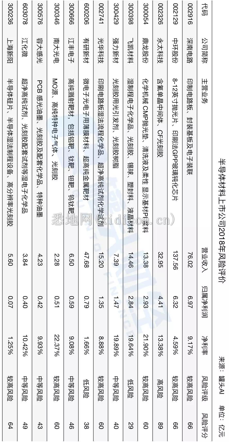 可以看到,生产基板的深南电路,和生产硅片的中环股份这两家头部半导体材料公司2018年净利润都超过6亿。而生产特种气体、光刻胶的南大光电,和生产抛光垫、清洗液的鼎龙股份两家公司净利率都超过20%。专注于光刻胶生产的强力新材净利率也逼近20%。