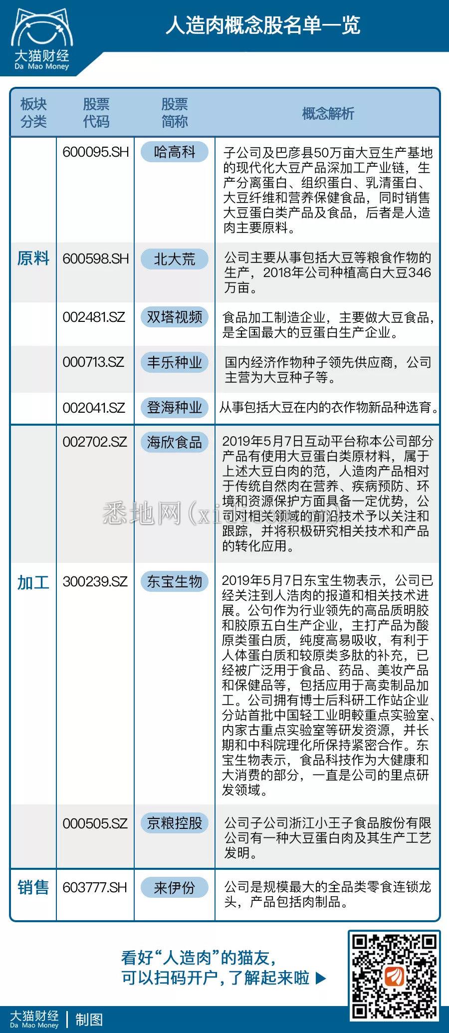 其实A股中的“人造肉”概念股还处在炒作主题阶段,并没有生产出像Beyond Meat公司一样口感的产品,不过随着A股上市公司逐步加大科技研发和布局人造肉市场,并不一定比国外公司竞争力弱。尤其是在中国这个肉产品消费大国中,人口基数大,哪怕有很少比例的市场份额,也会成长出一些“人造肉”巨头,更何况还有海外市场的成长空间。因此,猫哥整理了一份目前A股上有一定技术底蕴和先发优势的“人造肉”概念股名单供大家参考。