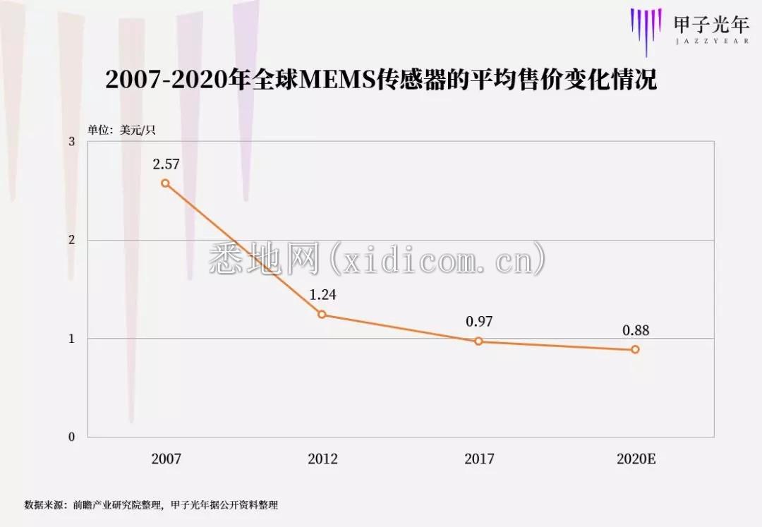 2007年-2020年全球MEMS传感器的平均售价变化情况(单位:美元/只)