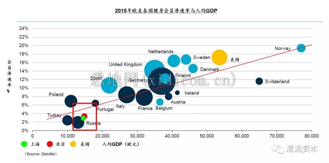 宏观来看健身行业呈现强相关性的指标包括:GDP、肥胖率、单人家庭比率。以GDP为例,根据国家统计局的数据,2018年北京、上海人均GDP突破2万美元,参考上图中全球范围内人均GDP与会员渗透率的象限关系,国内市场仍存在非常大的提升空间,消费力的增长先行于健身的普及,良好的经济基础与新一代人群对于健康认知和运动审美的提升将是行业最好的催化剂。除北京上海外,包括广深、杭州等其他一二线城市的GDP高增长都为健身行业的发展提供了沃土。