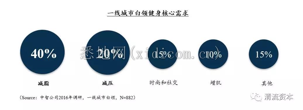 今天的消费者对于健身体验有了更加明确的目的性,根据对一线白领用户的样本调研,新一代用户对于减脂、减压、社交的需求十分明确,工作之余通过运动燃烧脂肪,放松身心、减少压力。以上需求特征与传统核心健身用户对于增肌塑形的刚性需求有着明显区别,不同程度的健身人群的需求垂直化趋势明显。