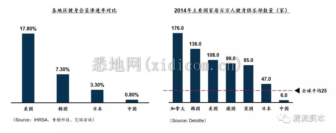 根据IHRSA的统计,无论是从健身会员渗透率还是在每百万人口对应所享有的俱乐部数量上,我国与发达国家存在很大的差距。在一线城市北京、上海(约在3%)的会员渗透率水平勉强与日本平均水平看齐。截至2018年全国平均水平不足0.8%,与日韩、美国存在几何倍数差距,但这一数据对比国内2014年的0.4%呈现了成倍的增长。