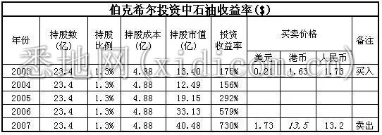 巴菲特的成本不超过每股1.7港币元。5年后的2007年7-10月,巴菲特全部卖出了中国石油的股份,每股卖出价约为13.5港元,卖出总市值约为40亿美元,大赚特赚。