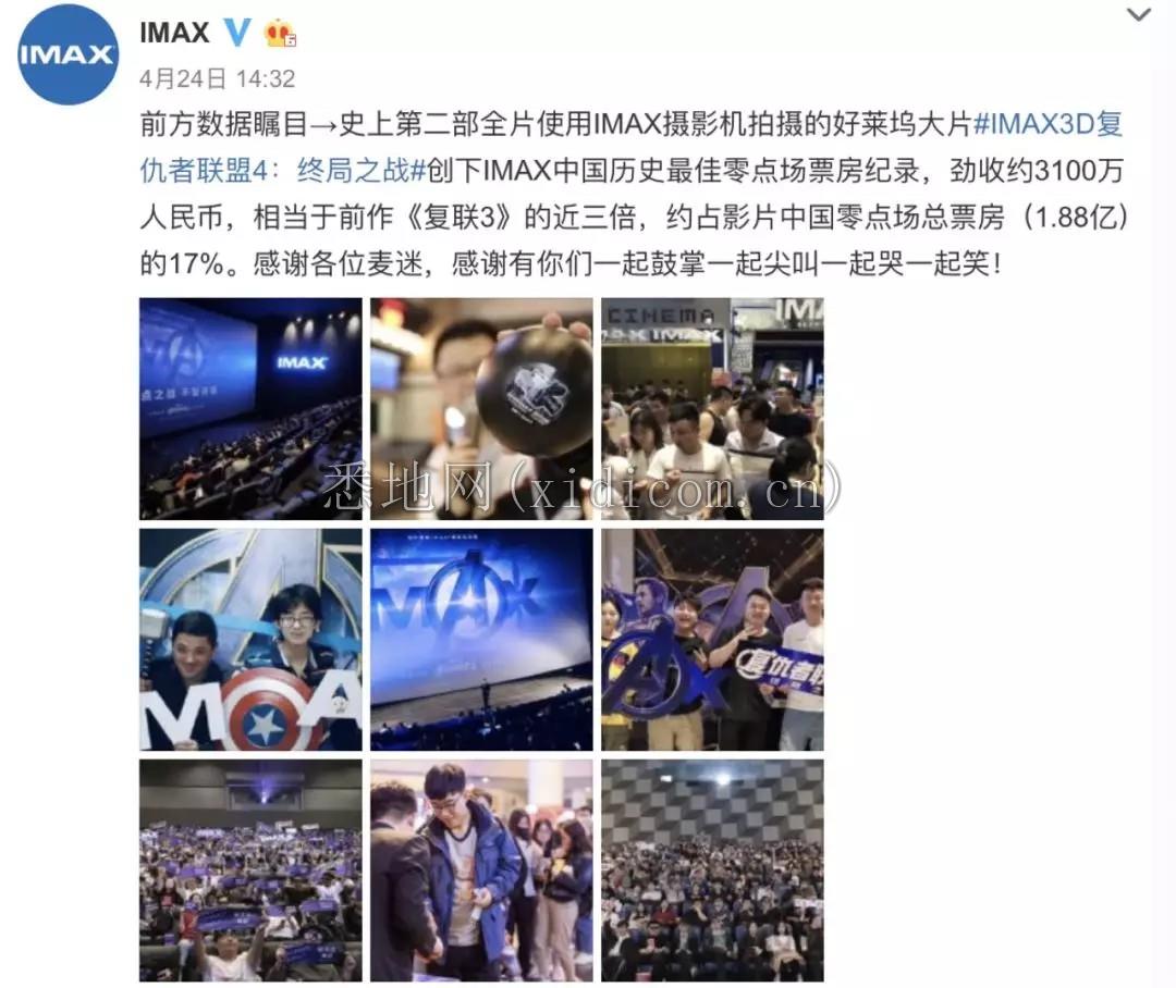 “要看就第一时间看,再贵也要看。”作为超英铁粉,小书在《复联4》预售开启后就凭借惊人的手速抢到了自己心仪的场子和位置,和他一样激动并坚定的大有人在。据IMAX方提供的数据显示,中国零点场收入估计约3100万元,相当于前作《复仇者联盟3:无限战争》IMAX中国零点场票房的近三倍,这一成绩创下了IMAX中国历史最佳零点场票房纪录。