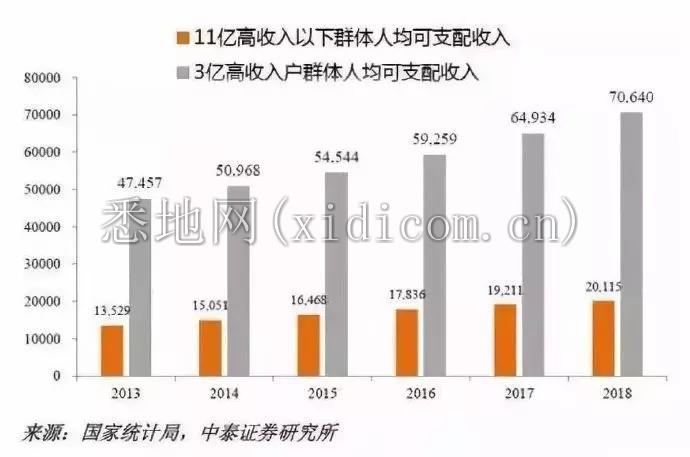 官方统计数据显示的情况也不乐观,2018年国家统计局的统计公报,中低收入、中等收入和中高收入三个组的人口之和占总人口60%,但其可支配人均收入增速只有4.4%,不足2018年9.7%的名义GDP增速的一半。