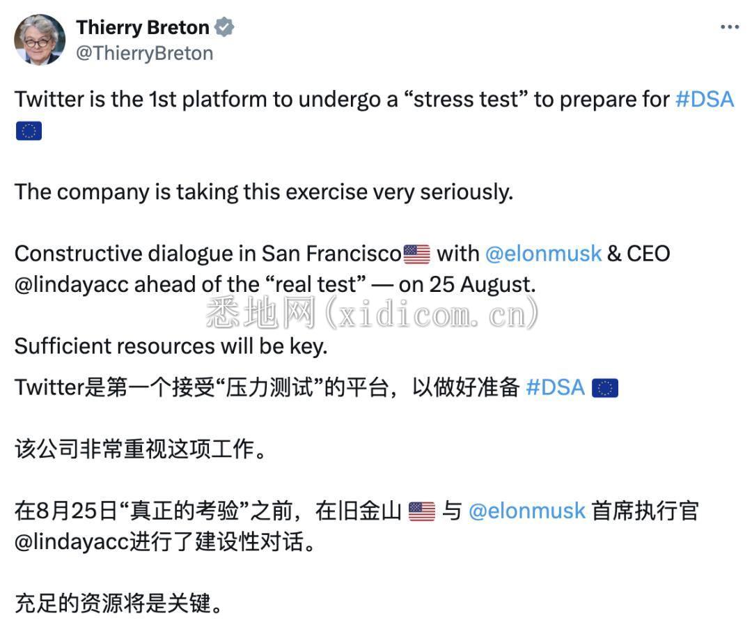 按照报道来说,马斯克的配合态度那是一等一的积极,转眼就收到了布雷顿的公开表扬信:Twitter是第一个接受“压力测试”的平台,公司非常严肃认真地对待这场“演习”。