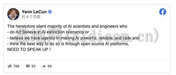 LeCun也再次出来唱反调,表明了他对AI安全问题的立场: