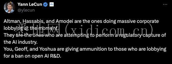 在Geoffrey Hinton携手一众大神关于AGI风险治理的声明,Lecun没有署名,并且直接在X上点名了Sam Altman和DeepMind的Hassabis等人,认为他们试图通过游说监管来巩固自己的行业地位,阻碍开放AI推进。