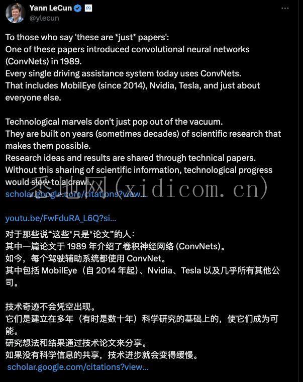 LeCun还反驳了那些轻视学术论文观点,作为“卷积网络之父”,他举例说明卷积神经网络(ConvNets)这一在1989年由学术论文引入的技术,已经成为当今几乎所有驾驶辅助系统的核心组成部分。