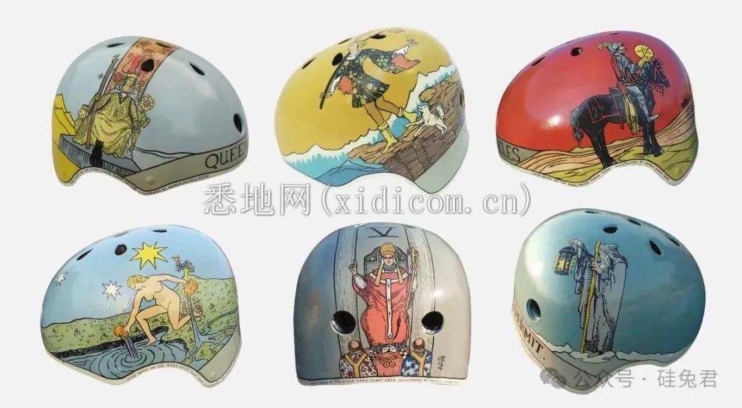 还有设计更加有趣和出众的自行车头盔Inkwell Helmets。几年前Baskin就曾有过将塔罗加入到这一头盔生意中的想法,她想把78张塔罗牌设计在不同的头盔上并在纽约售卖,这样当行人每天出行的时候,就可以根据路过的塔罗头盔解读每天的运势了。