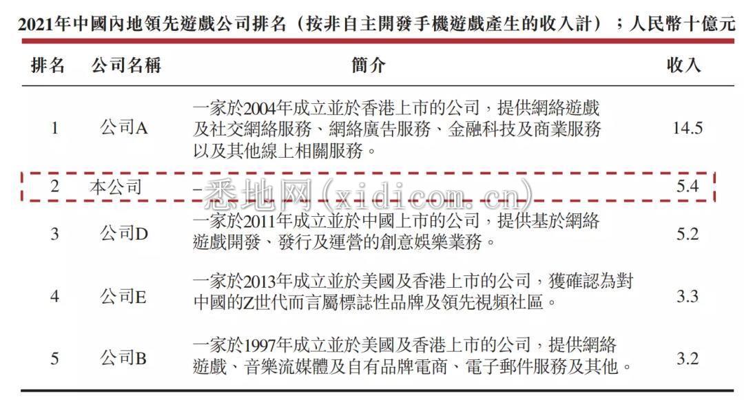 其实这个数据已经比两年前低了。其2022年11月公开的招股书中透露,2021年中旭未来的收入和市场份额是仅次于腾讯、网易、公司C、三七互娱的,市场份额达到2%;而在非自研移动游戏产品的收入上,中旭未来也仅次于腾讯的145亿元,以54亿元位居第二,突出于三七互娱、B站以及网易。
