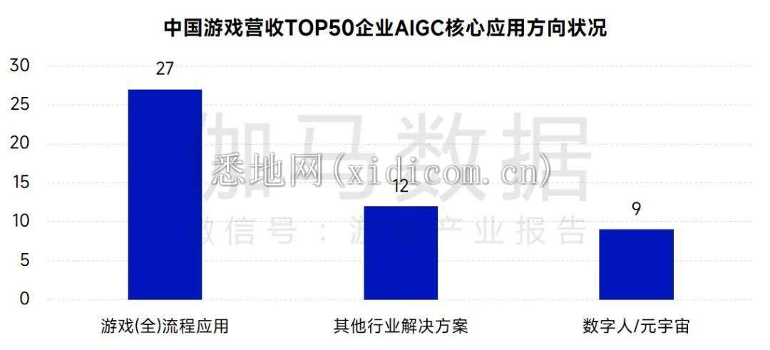 伽马数据去年7月发布的《中国游戏产业AIGC发展前景报告》显示,游戏业务收入TOP50的企业中,已有超六成明确布局AIGC领域,且有实质性动作。其中27家企业投入到了游戏研发、营销、运营等游戏产业全流程应用层面;12家企业运用AIGC相关技术,为其他行业或企业提供解决方案;9家企业选择重点布局数字人/元宇宙领域。
