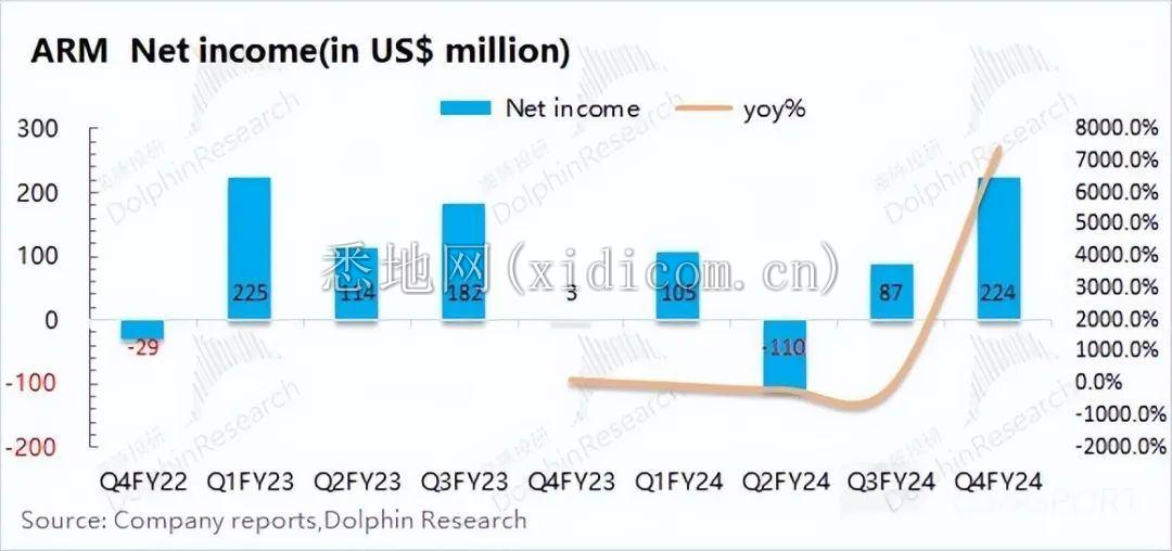 ARM 在 2024 财年第四季度(即 24Q1)实现净利润 2.24 亿美元,同比/环比均有明显提升,好于市场预期(1.45 亿美元)。本季度净利率 24.1%。