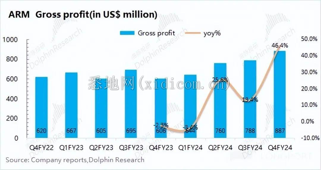 ARM 在 2024 财年第四季度(即 24Q1)实现毛利 8.87 亿美元,同比增长 46.4%。毛利端同比增速与收入接近。