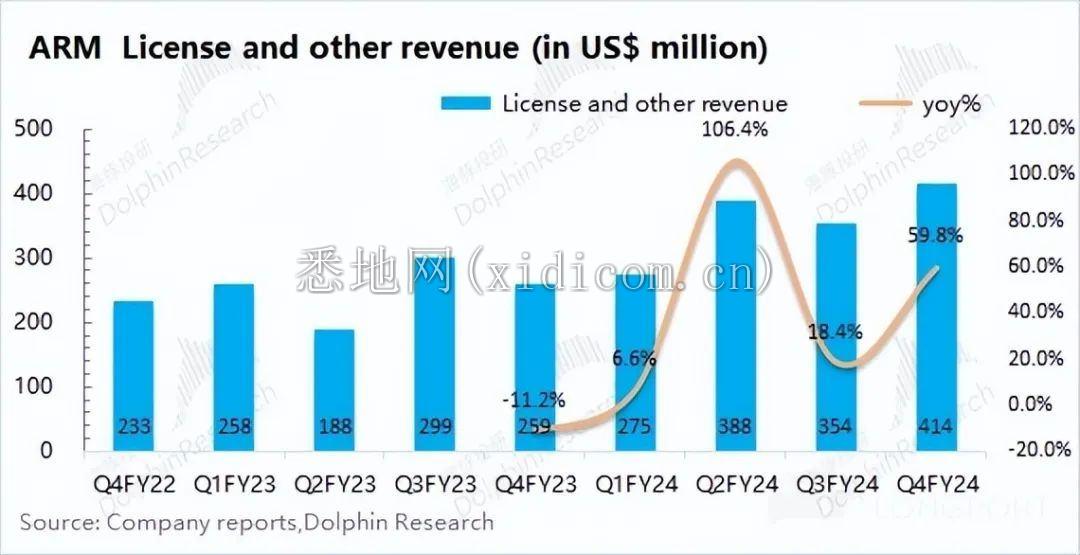 ARM 的许可证业务在 2024 财年第四季度(即 24Q1)实现营收 4.14 亿美元,同比增长 59.8%。随着 AI 等需求的增长,下游有更多的客户采用 ARM 来研发芯片。