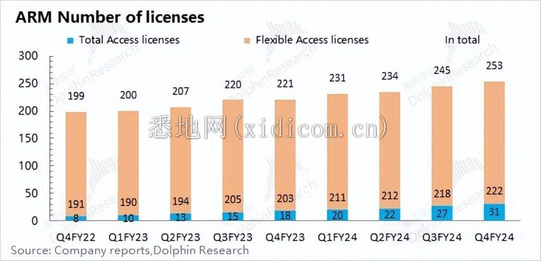 2、各业务细分:许可证&版税,继续增长。受 AI 等需求的带动,公司许可证客户数目继续提升。虽然受半导体周期影响,ARM 授权芯片数目有所下滑,但单颗芯片授权费用同比提升 53.1%。