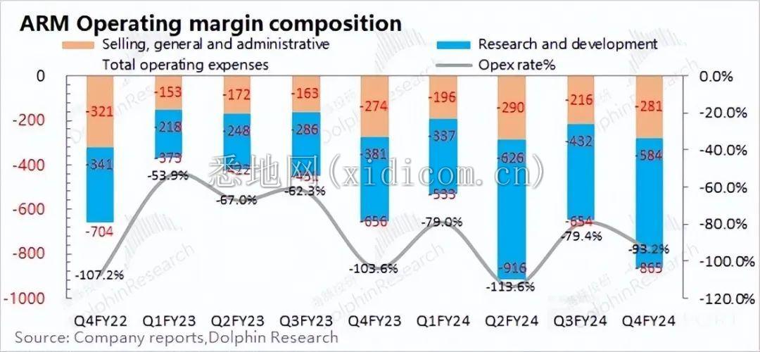 ARM 在 2024 财年第四季度(即 24Q1)的经营费用为 8.65 亿美元,同比增长 31.9%。公司保持高投入,继续扩大研发人员规模。
