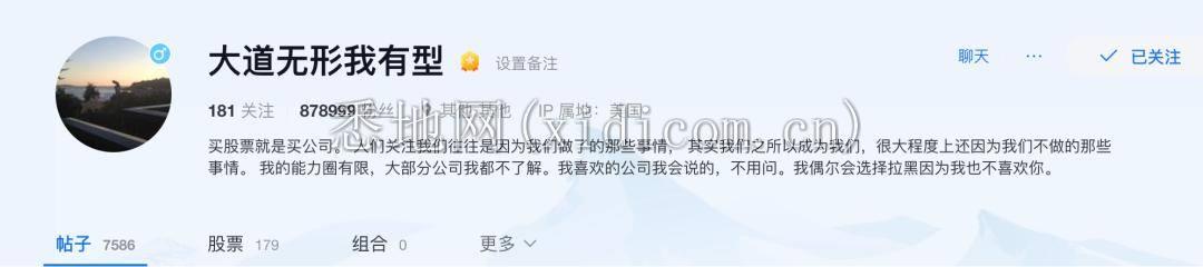 被大道关注更是一种荣幸。一些追随者从博客时期就开始在网上与段永平互动的。2018 年网易博客更改为 Lofter,段永平不喜欢,于是转道雪球。他发了一条博客说“博友们可以在雪球上开个号”,留言告诉他,他会加关注。现在关注他的人更多了,想要被关注不太容易。大道的规则是至少要有 2 个他已经关注的人推荐,他也会事先看下申请人的申请内容和发言观点。他在雪球上只关注了 181 人。