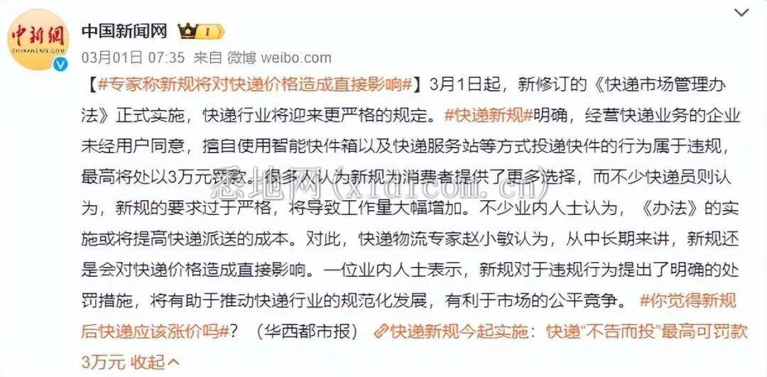 3月1日起,新修订的《快递市场管理办法》实施,新规明确,经营快递业务的企业未经用户同意,擅自使用智能快件箱以及快递服务站等方式投递快件的行为属于违规,最高将处以3万元罚款。