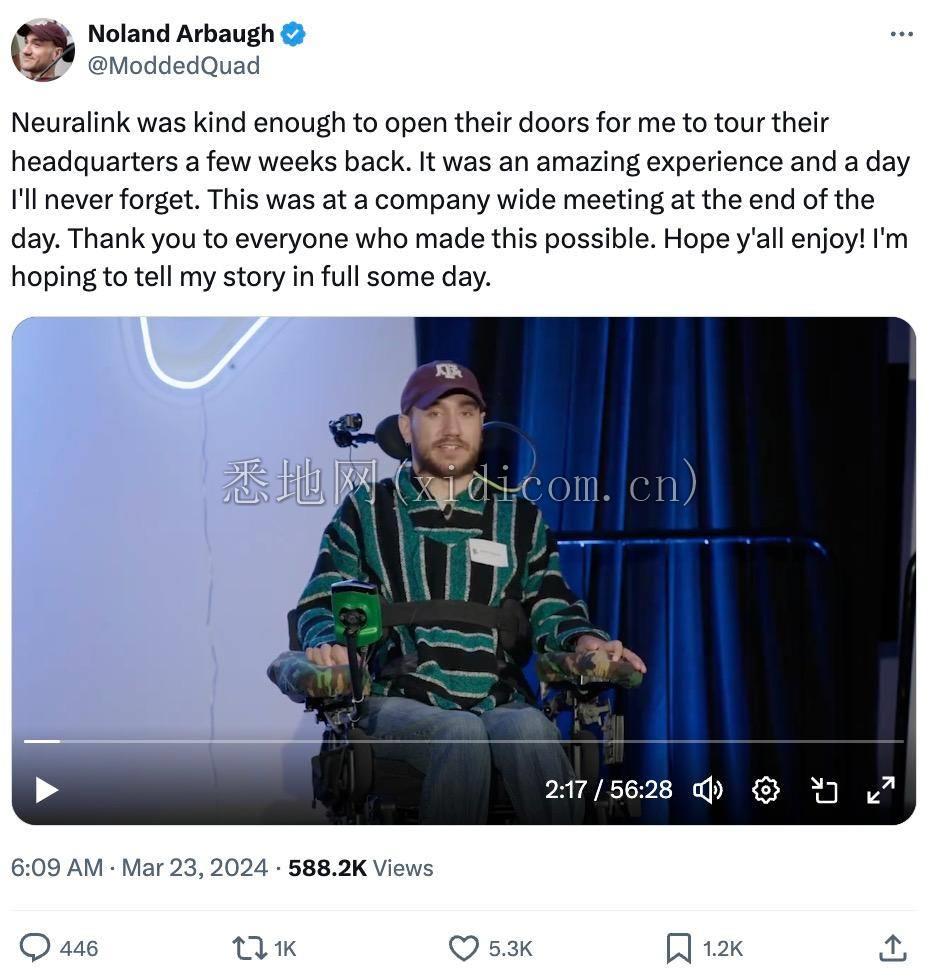 Noland 近期参观了 Neuralink 总部,并在参观结束时的一场公司内部会议上与大家见面,进行了近一小时的访谈对话。今天他在 X 上公开了这段演讲视频。