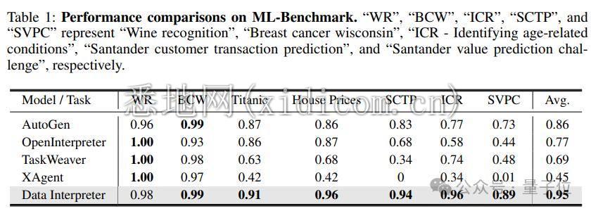 为了测试Data Interpreter的精准和效率,研究团队还设计了ML-Benchmark,这是一个集合了Kaggle网站上多种经典机器学习任务的测试集。