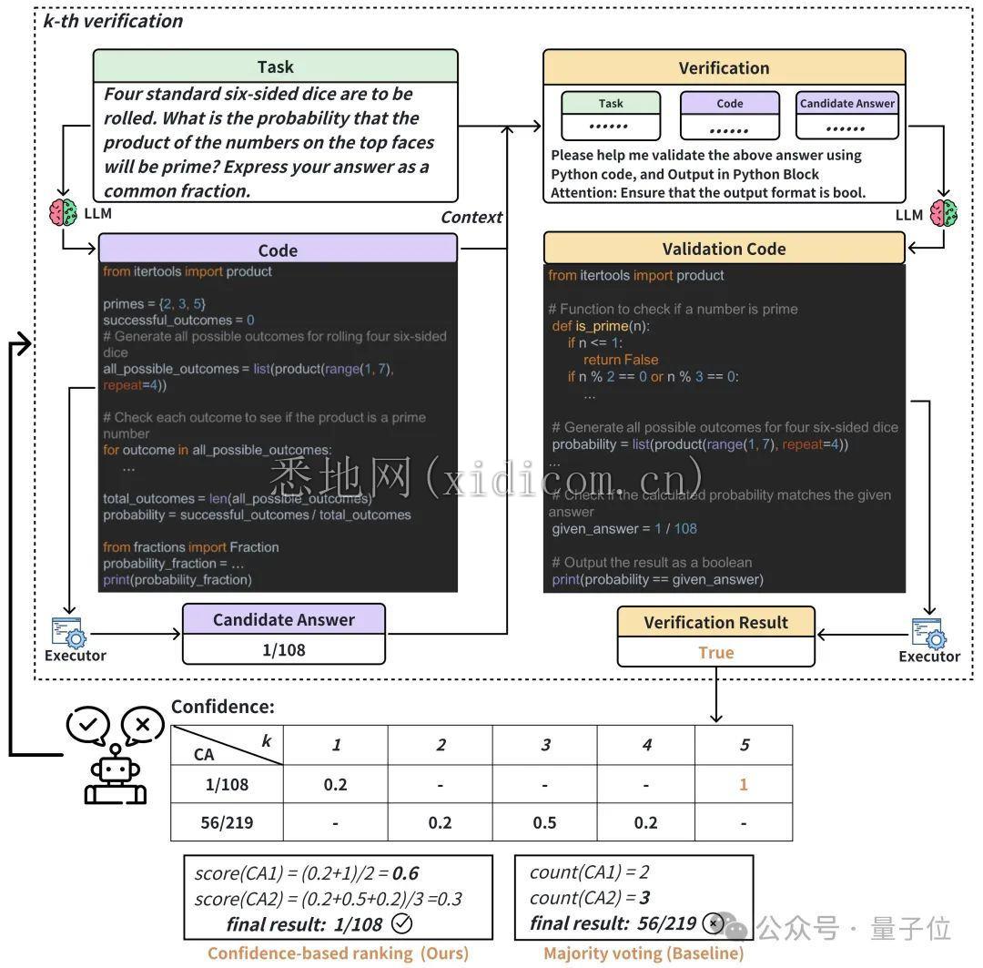 下图以MATH内的一个任务说明基于置信度自动验证流程,虚线框内是自动验证的过程,虚线框下方根据验证对多个候选答案进行排序: