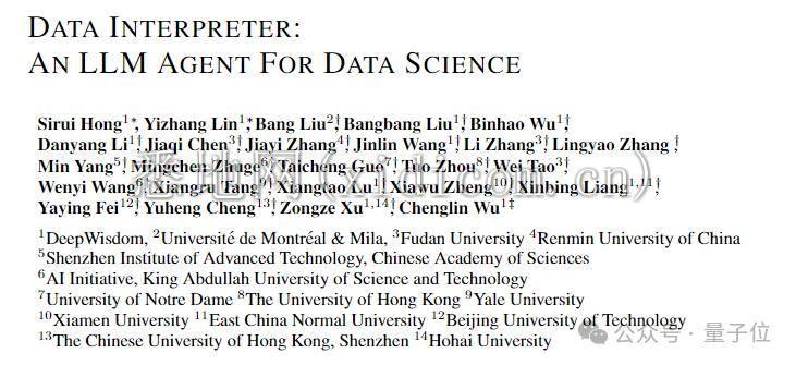 Data Interpreter由MetaGPT团队联合北京工业大学、复旦大学、华东师范大学、河海大学、加拿大蒙特利尔大学、KAUST、圣母大学、厦门大学、香港中文大学(深圳)、香港大学、耶鲁大学、中国科学院深圳先进技术研究院、中国人民大学共同推出。