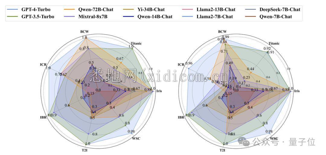 在机器学习的任务中,更大尺寸的LLM,例如Qwen-72B-Chat和Mixtral-8x7B展现出与GPT-3.5-Turbo相当的表现,而较小的模型则性能下降较多。