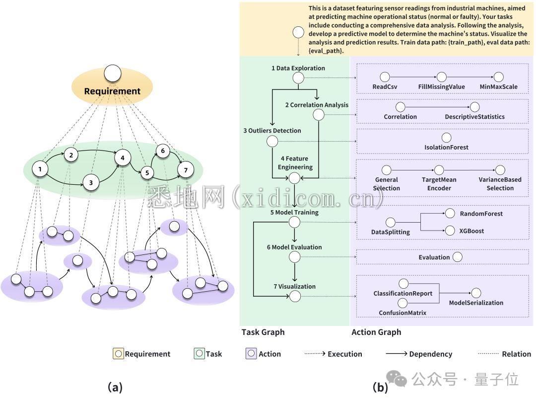 分层结构:(a) 一个有组织的任务和动作图,展示了高层级机器学习项目的工作流程,包括实现项目目标所需的任务依赖和动作序列。(b) 任务的有向无环图(DAG),以机器操作状态预测问题为例。任务图展示了拆解的计划任务,而动作图(也称为执行图)则根据计划的任务图执行各个节点。每个节点的执行代码由LLM转换。