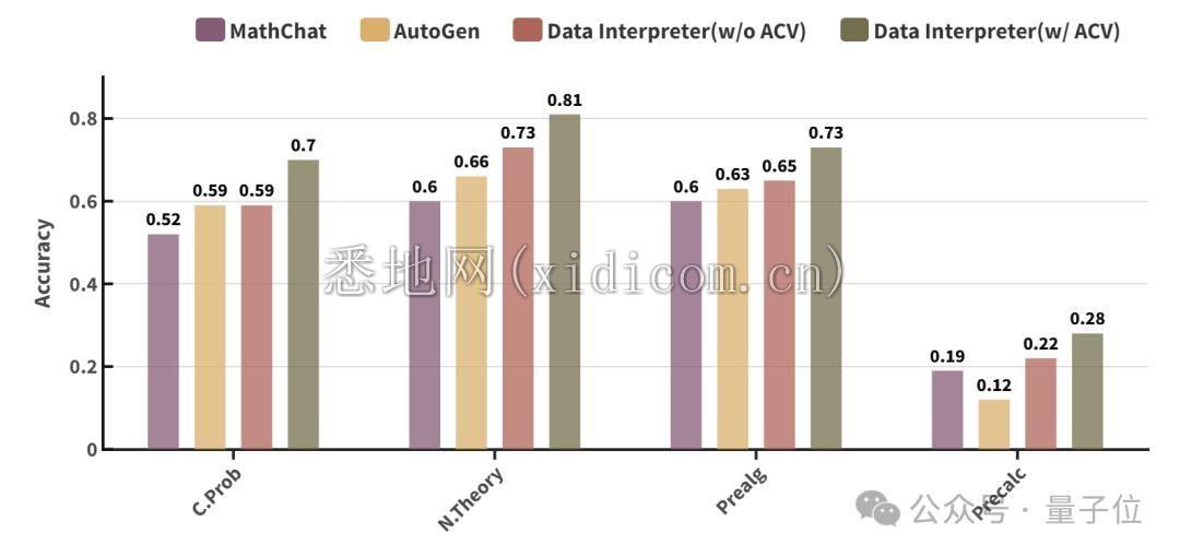 为评估Data Interpreter在这一领域的性能,研究团队选择了MATH基准测试中难度最高的Level-5问题,这些问题涉及计数和概率(C.Prob)、数论(N.Theory)、初等代数(Prealg)和微积分(Precalc)等四个类别。