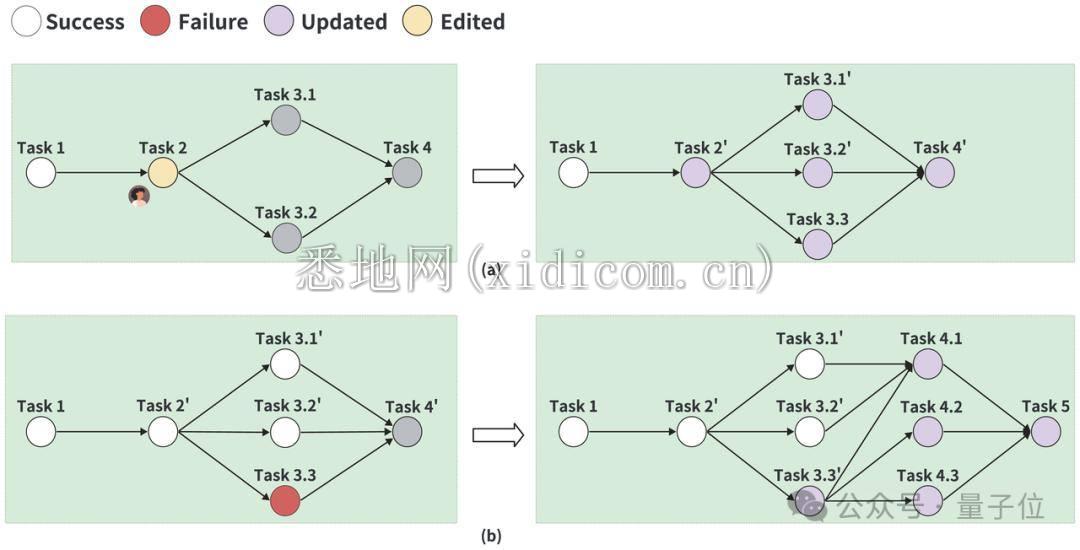 数据解释器的动态计划管理:(a) 通过人工编辑进行计划细化。左侧图像显示了在图上经过人工编辑的任务,右侧图像则展示了细化后的计划,包括更新后的任务3.1’、3.2’以及新增的任务3.3。(b) 对失败任务的计划进行细化。在任务执行后,如果任务3.3失败,细化后的计划将整合已有的成功任务,用更新后的任务3.3’替换原任务3.3,并引入新任务4.1、4.2、4.3和5。