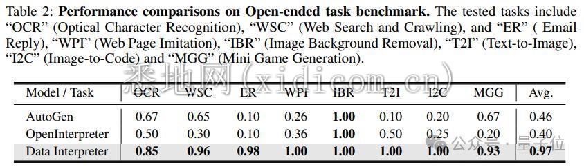 结果显示,Data Interpreter在开放式任务上的平均完成率为0.97,与AutoGen相比大幅提高了112%。对于去除图像背景(IBR)任务,所有三个框架都获得了1.0的完整分数。