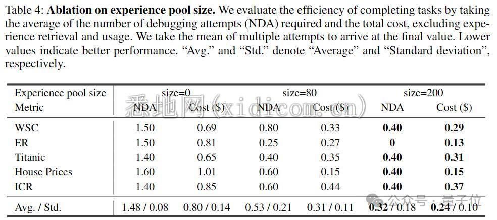 随着经验池从1增加至200,平均的debug次数从1.48降低到了0.32,执行成本从0.80美元降低到了0.24美元,表明经验的累计对于从自然语言描述任务到代码生成能够有明显的帮助。