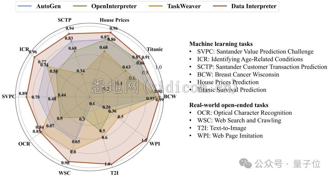 通过任务完成率(CR)、归一化性能得分(NPS)和综合得分(CS)这三个关键指标,Data Interpreter在七项任务上的平均得分高达0.95,远超AutoGen的0.86,提升了10.3%。