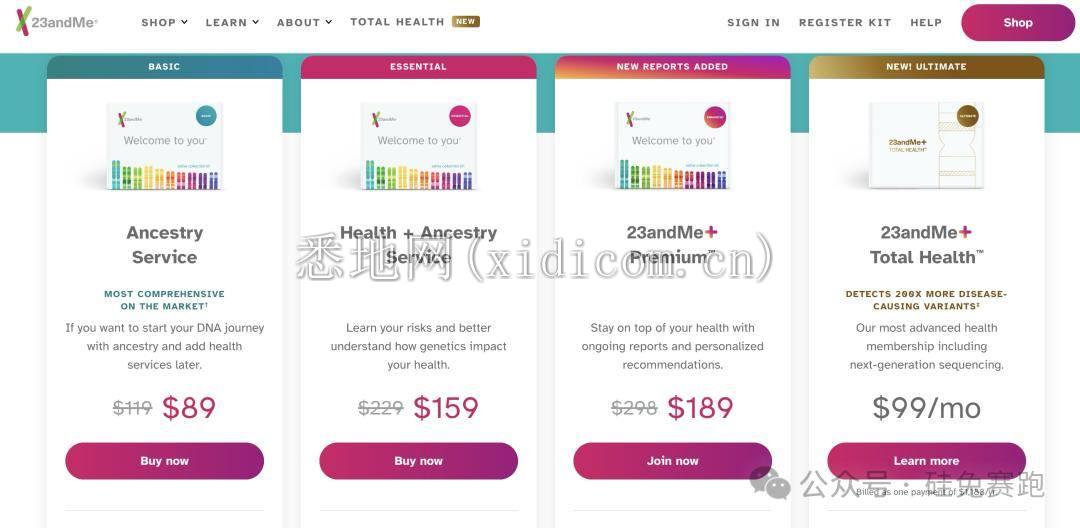 23andMe也在努力通过增加多元化服务创造收入,从仅提供信息的科技公司变为既能提供信息又能提供治疗的医疗公司。比如,推出年度付费产品Total Health,提供半年一次的血液测试、外显子测序和基于遗传学的临床护理。