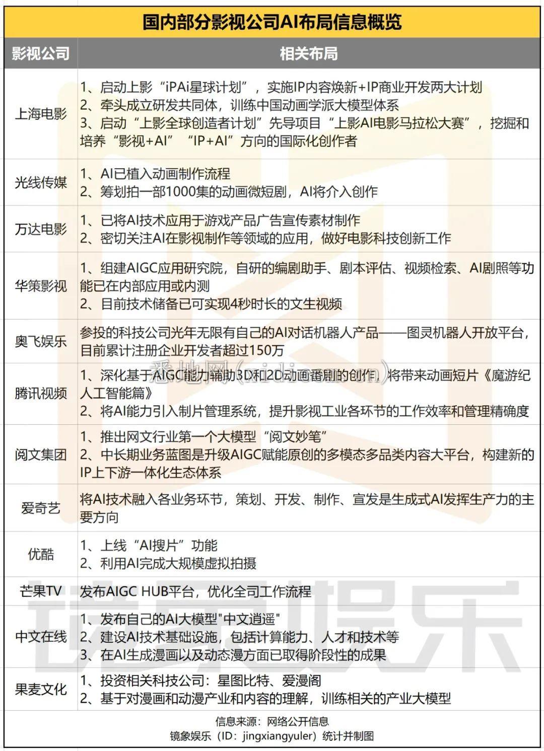 尤其是在Sora问世之后,相关技术的发展速度之快超出了太多人的想象。技术浪潮席卷之下,影视行业围绕AI的布局也在提速。据镜象娱乐不完全统计,优爱腾芒等视频平台,光线传媒、上海电影、华策影视等影视公司都在着力推进AI技术的研发与应用,从训练相关的大模型,到将AI技术应用于影视内容创作、宣发等更多环节,甚至开发AI全流程参与的作品,影视公司的脚步越来越快。