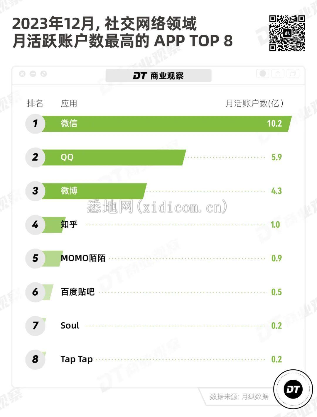 根据月狐数据2023年12月的统计,QQ月活跃账户数比微博和知乎加在一起还要多, 达到5.9亿。