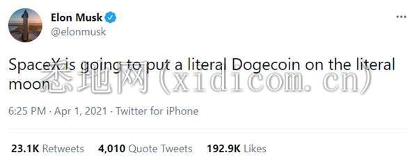 2021年,马斯克推特上说:“SpaceX将把一枚狗狗币送到月球上”。狗狗币的价格率先坐上了火箭,短短一个小时内,狗狗币从每枚约0.054美元大涨至最高点时的约0.069美元,涨幅高达27%。