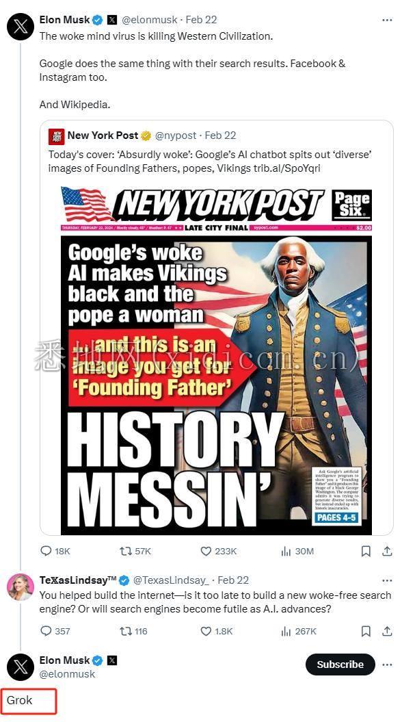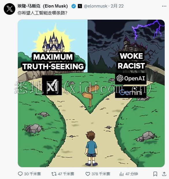 前不久Google的Gemini生成出黑人版马斯克,引起“种族歧视”问题时,马斯克带头冲锋,顺便给自家的Grok打了一下广告。