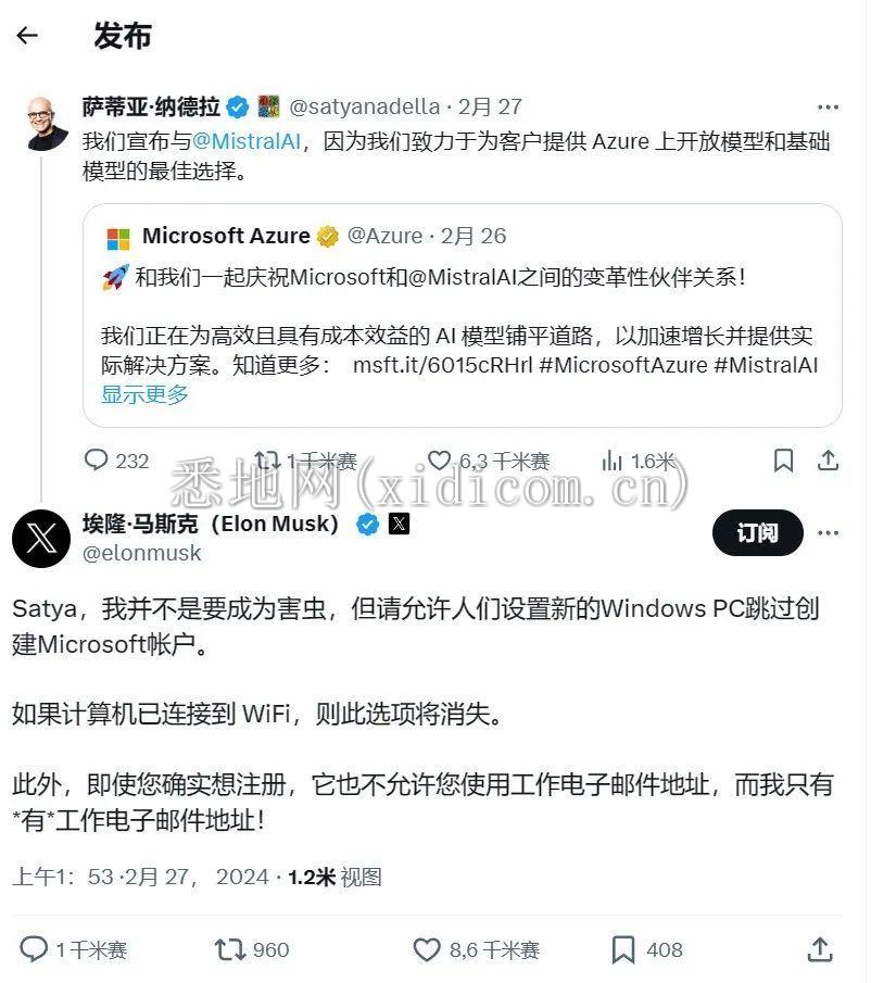 首先是刚才提到过,2月27号,马斯克吐槽Win11,使用PC必须要登陆微软账号,还在微软CEO纳德拉twitter下评论注册微软账号有多麻烦。