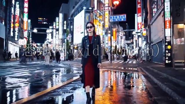 此外,用更具体的prompt也可以获得时长更久的视频,如下便是以“一位时尚女性走在充满温暖霓虹灯和动画城市标牌的东京街道上。她穿着黑色皮夹克、红色长裙和黑色靴子,拎着黑色钱包。她戴着太阳镜,涂着红色口红。她走路自信又随意。街道潮湿且反光,在彩色灯光的照射下形成镜面效果。许多行人走来走去”为提示词生成的视频。