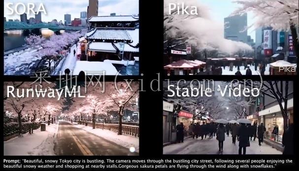 首先,最直接差距的便是视频长度的提升,社交平台上一位名为“Gabor Cselle”的博主将相同的prompt“美丽、白雪皑皑的东京熙熙攘攘,镜头穿过熙熙攘攘的城市街道,跟随几个人享受美丽的雪天,在附近的摊位购物,绚丽的樱花花瓣随着雪花随风飘扬”输入给Sora、Pika、Runway、Stable Video四个模型后,它们给出的结果是这样的。