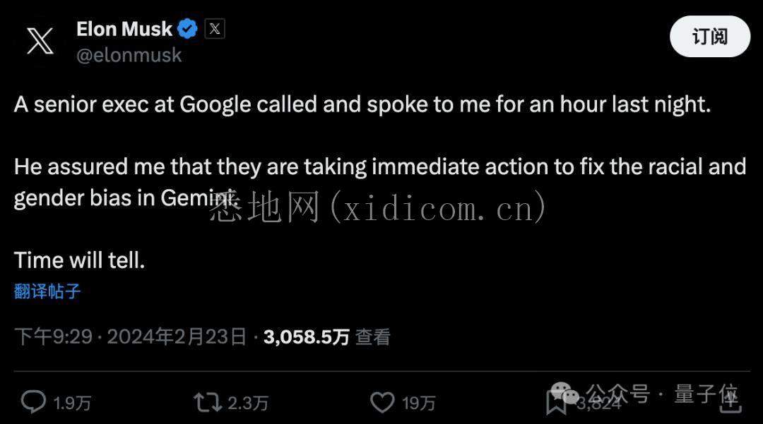 马斯克在X中亲自爆料称,谷歌一位高管和他在前一晚打了一个小时的电话,并向马斯克保证会解决Gemini在种族和性别歧视上的问题。