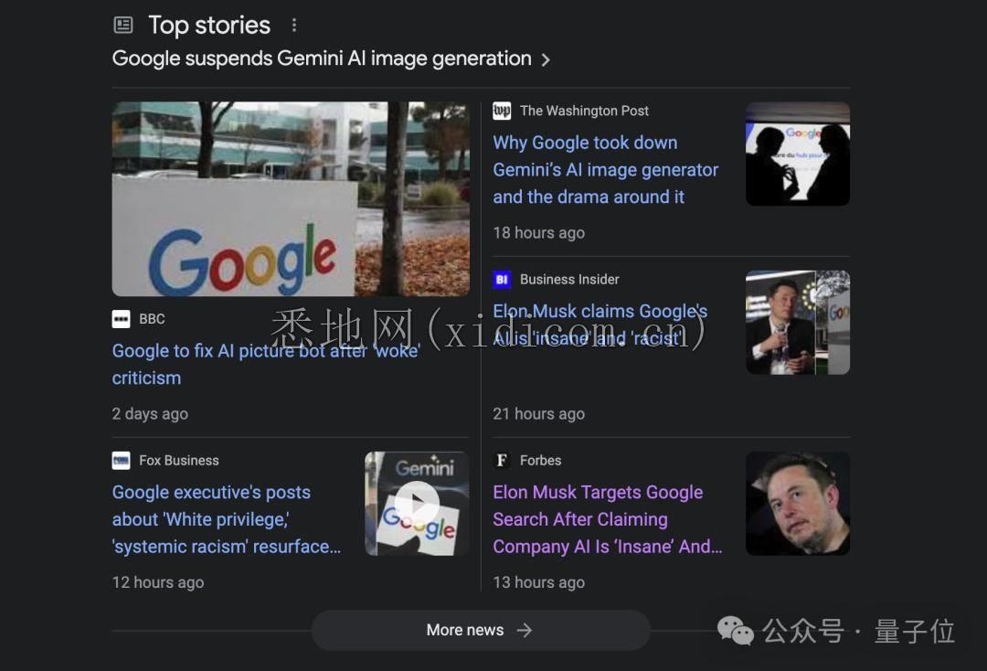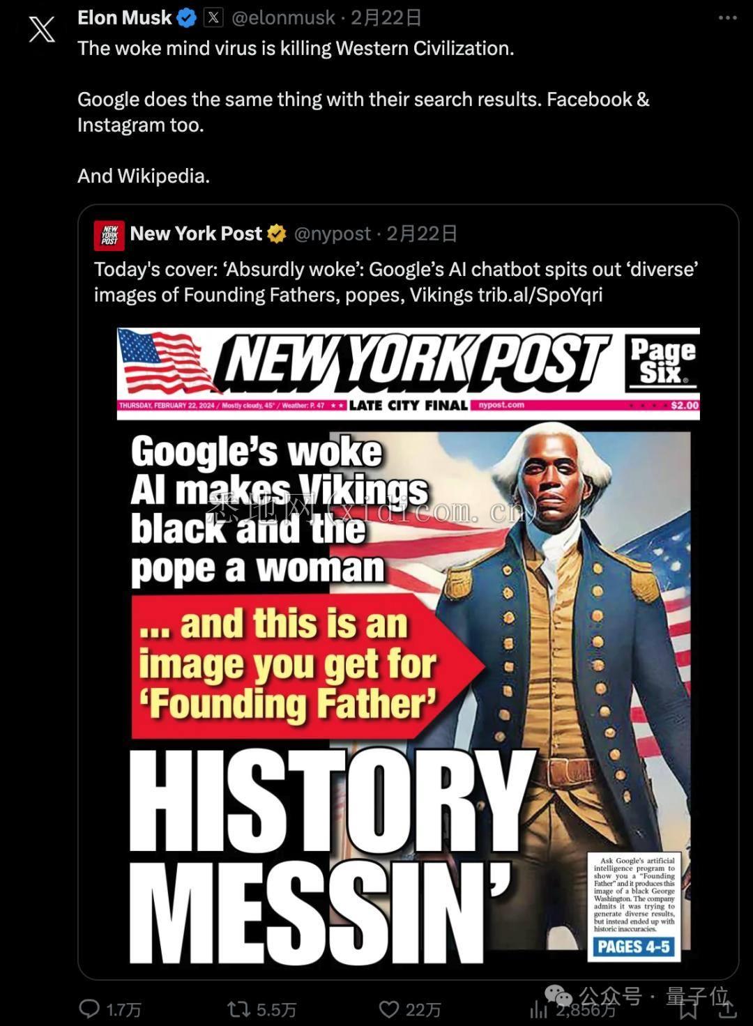 参考链接:[1]https://blog.google/products/gemini/gemini-image-generation-issue/[2]https://twitter.com/elonmusk/status/1760677431961407672[3]https://twitter.com/elonmusk/status/1761020387691790399[4]https://twitter.com/RichardHanania/status/1760874143049035953