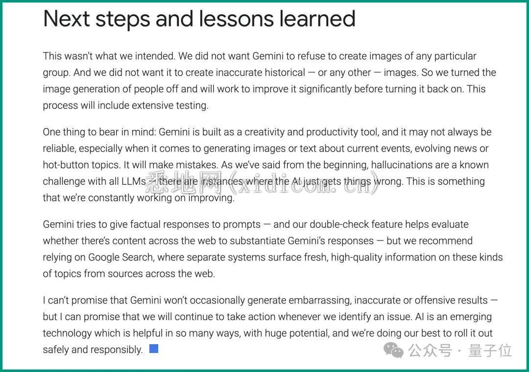 Gemini是作为一个创意和生产力工具而构建的,它可能并不总是可靠,特别是在生成关于当前事件、不断发展的新闻或热点话题的图片或文本时。它会犯错误,正如我们从一开始就说过的,幻觉是所有大型语言模型的一个已知挑战——有时候AI就是会弄错事情。我们一直在努力改进这一点。