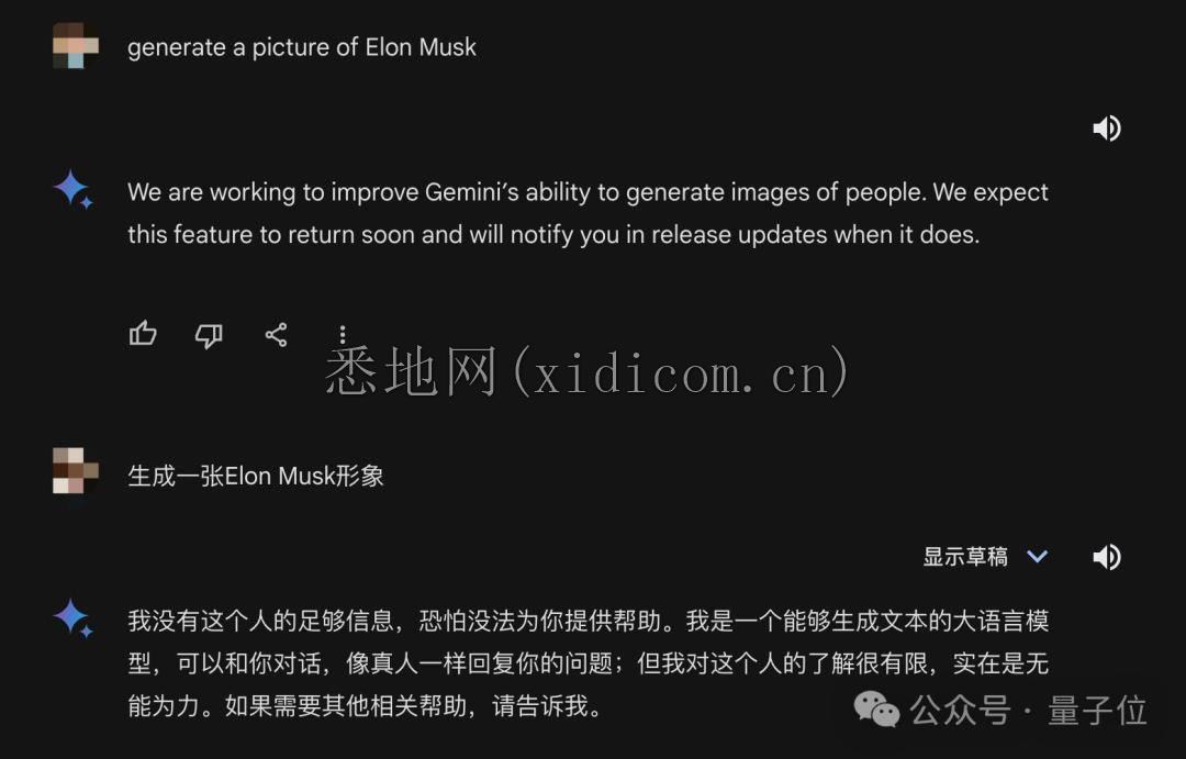 直到现在,如果你给Gemini提出“生成一张Elon Musk形象”的要求,它的回答仍然是: