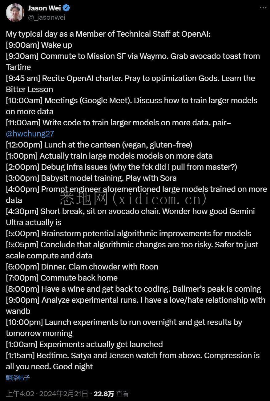 今天凌晨,OpenAI 研究人员 Jason Wei 自曝的每日工作时间线在社交网络上被疯传。