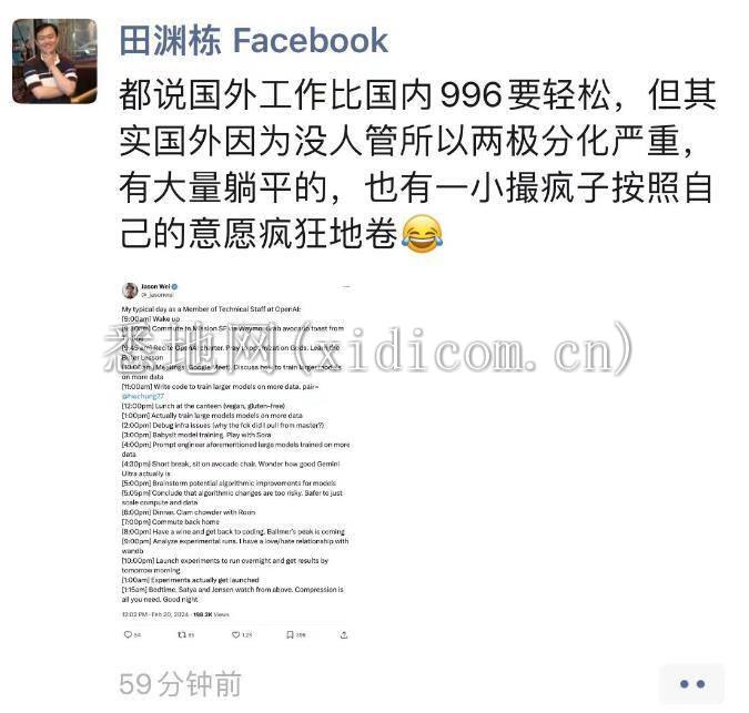 Meta FAIR 研究院研究员、高级经理田渊栋看完以后表示:都说国外没有 996,其实真正可怕的是自我驱动的卷。